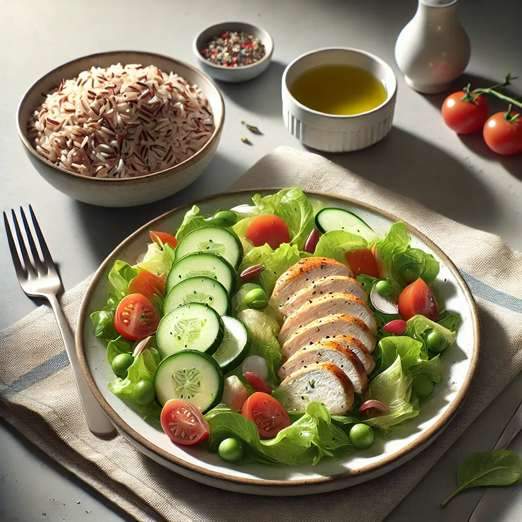 - 닭가슴살 샐러드 (채소, 올리브 오일 드레싱)