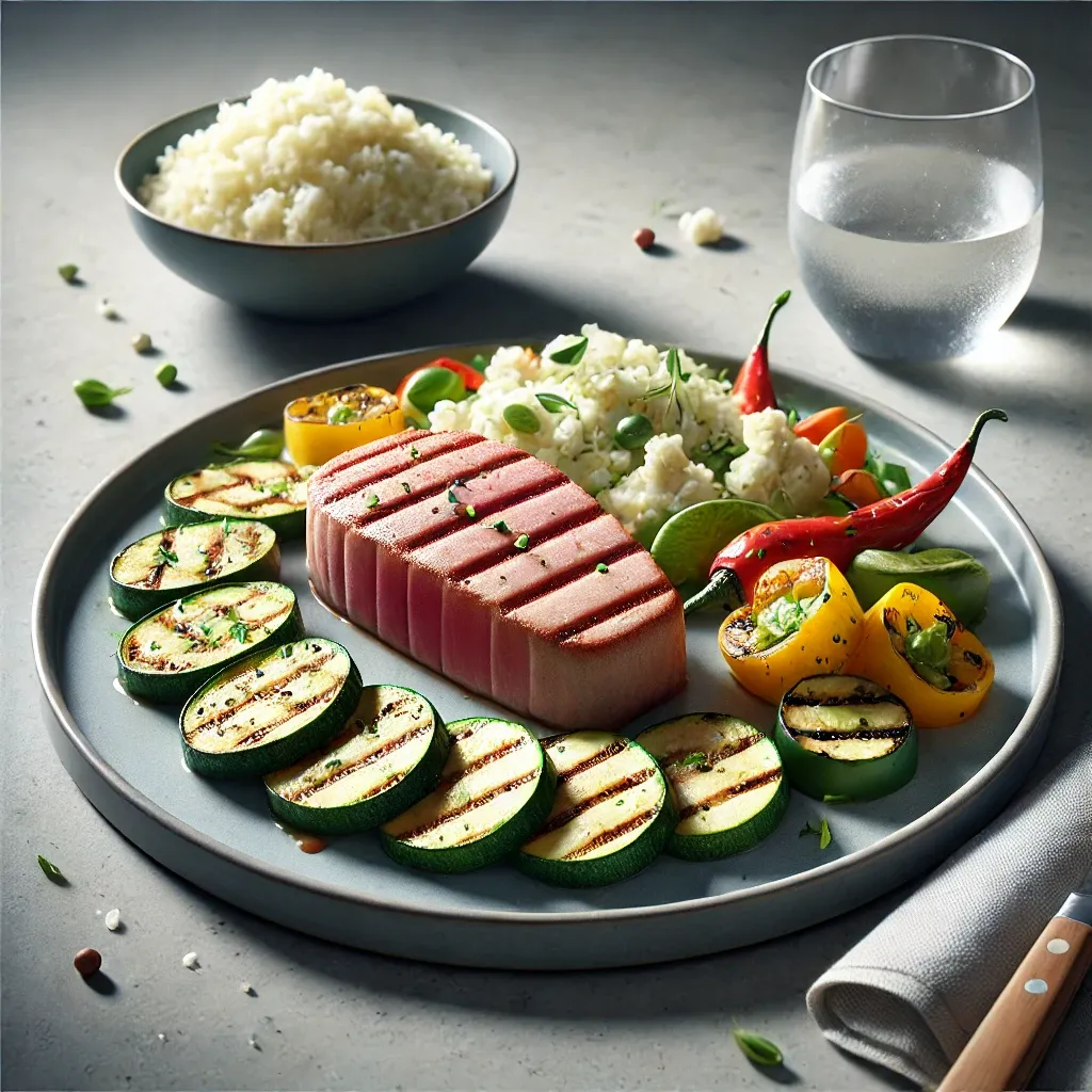 설명: 세 번째 날에는 해산물을 중심으로 한 식단입니다. 해산물은 고단백 저지방 식품으로, 특히 오메가-3 지방산이 풍부한 참치는 다이어트에 도움을 주며, 콜리플라워 라이스는 저탄수화물 대안으로 적합합니다.